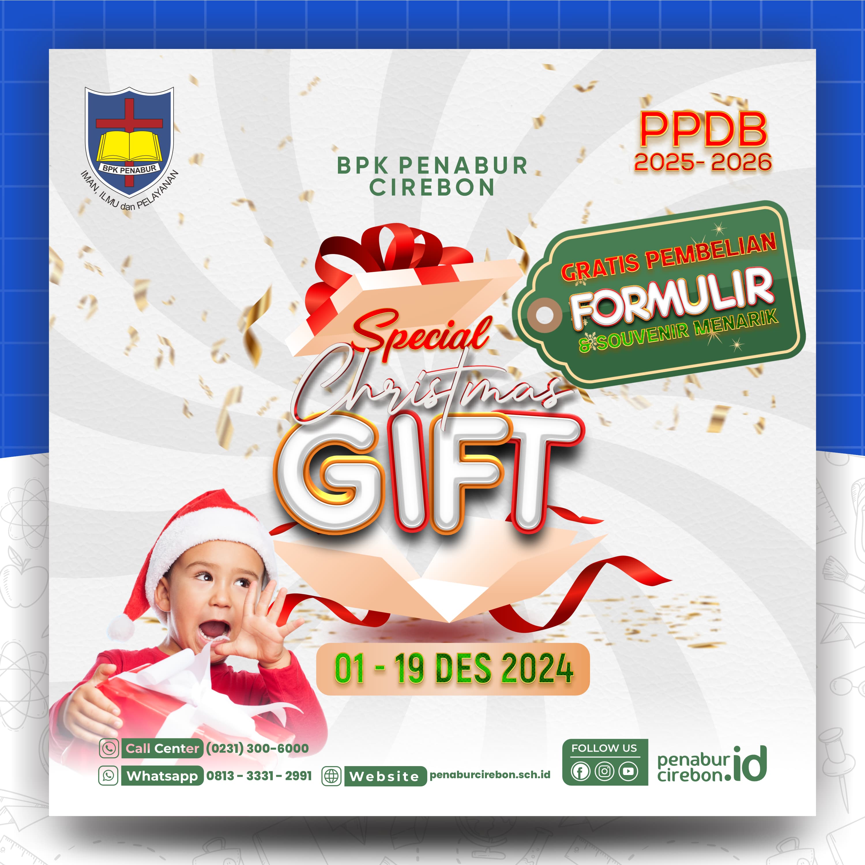 Tak hanya itu saja, BPK PENABUR Cirebon juga memberikan formulir gratis di seluruh jenjang pendidikan untuk PPDB (Penerimaan Peserta Didik Baru) Tahun Ajaran 2025/2026 di tanggal 01 hingga 19 Desember 2024. Melalui Special Christmas Gift ini kami turut mengajak seluruh orang tua dan anak untuk menikmati moment kebahagiaan dengan menggunakan kesempatan untuk mengambil formulir gratis ini dan bergabung agar menjadi bagian dari keluarga BPK PENABUR Cirebon.